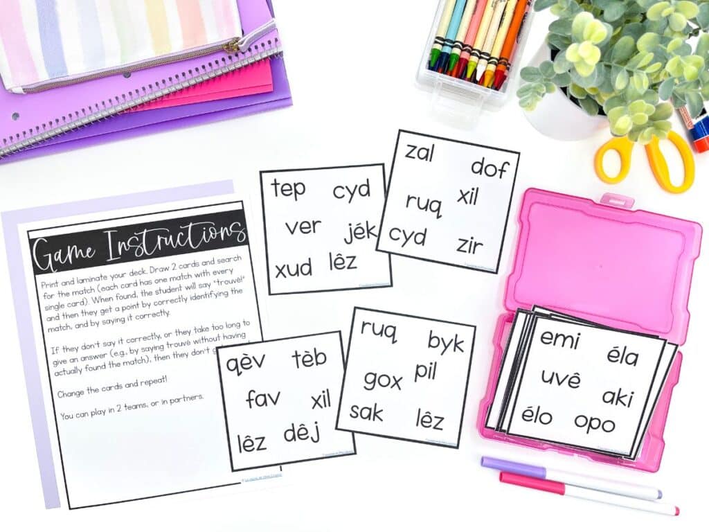 Each student gets a game card. They race to find a match with their partner and shout “trouvé!” when they find it. But here’s the key: the words are nonsense. That means students have to sound them out—they can’t rely on visual memory or vocabulary knowledge.