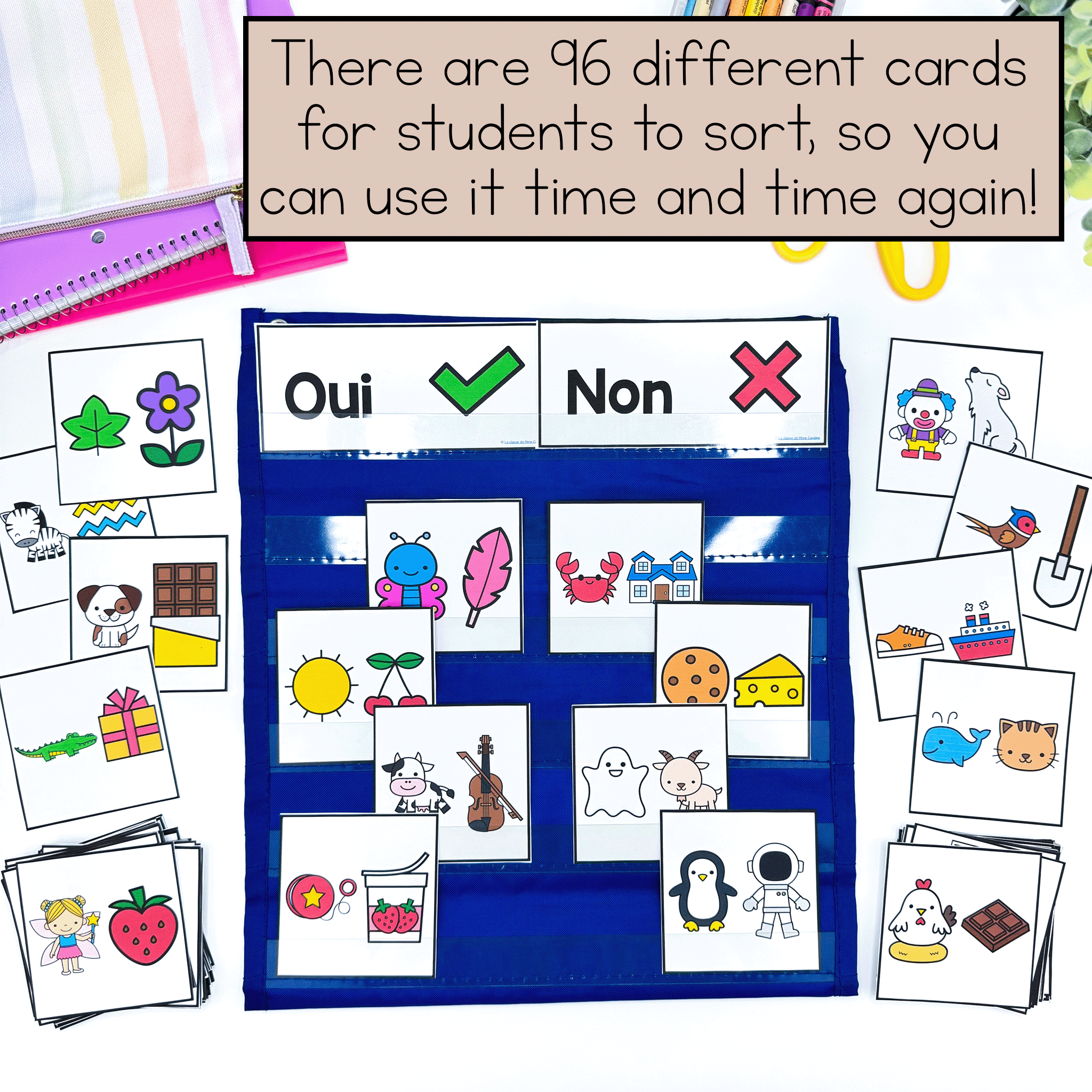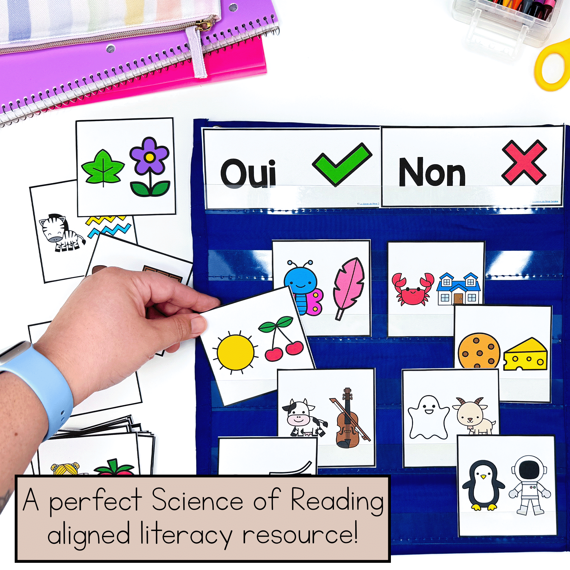Setup is quick and easy… Just grab a pocket chart, a handful of cards, and you’re ready for an engaging and educational French literacy activity!