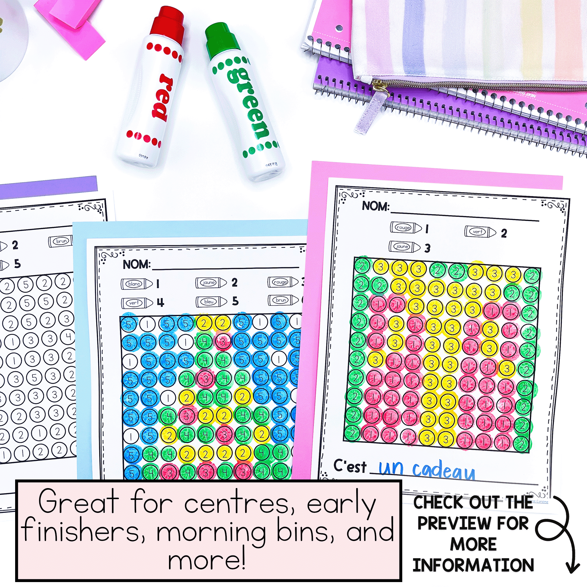 Your students will love the variety of activities included in this bundle. You’ll love that they have engaging activities to work on. You’ll never have to hear j’ai fini again! These activities are perfect for maternelle, première année, or deuxième année