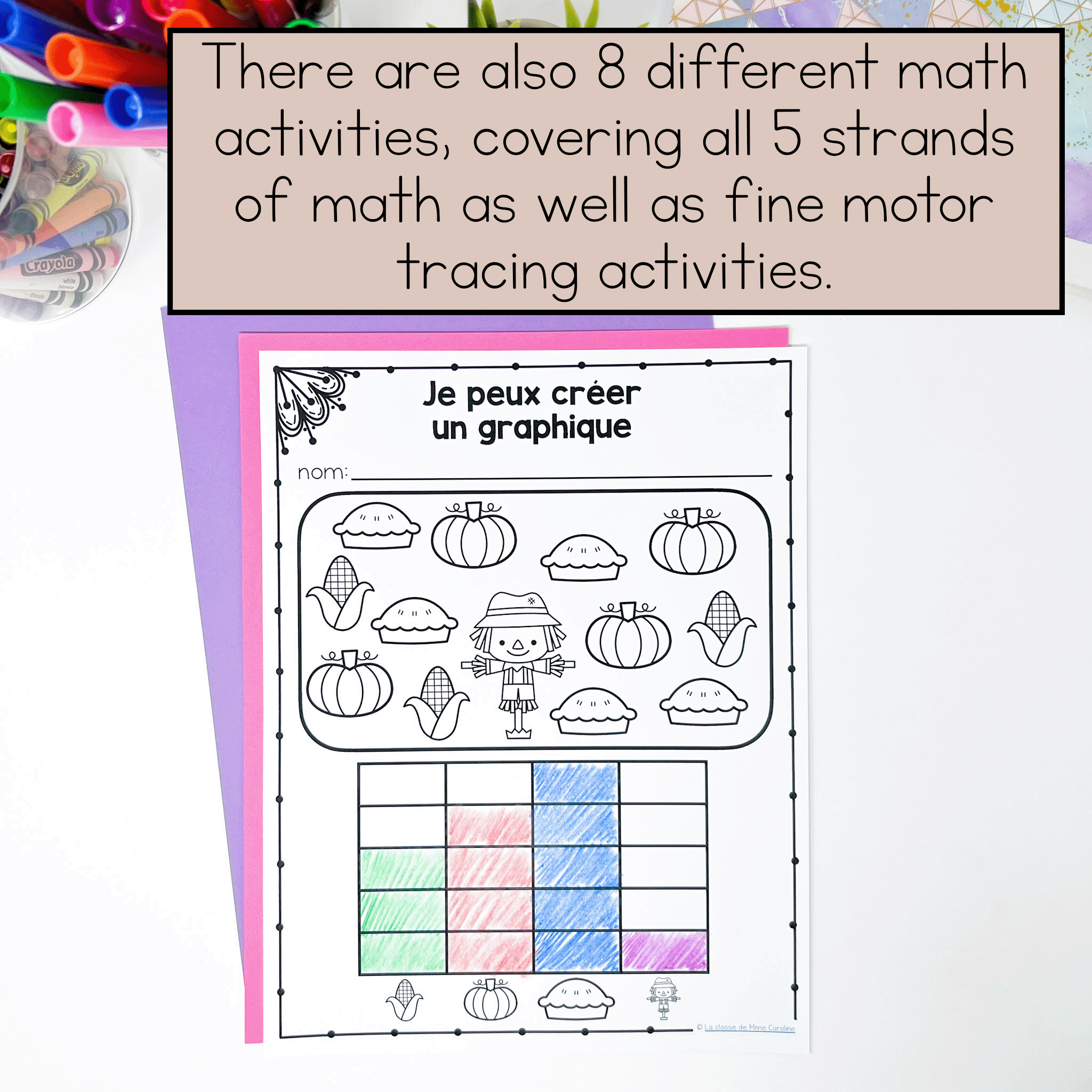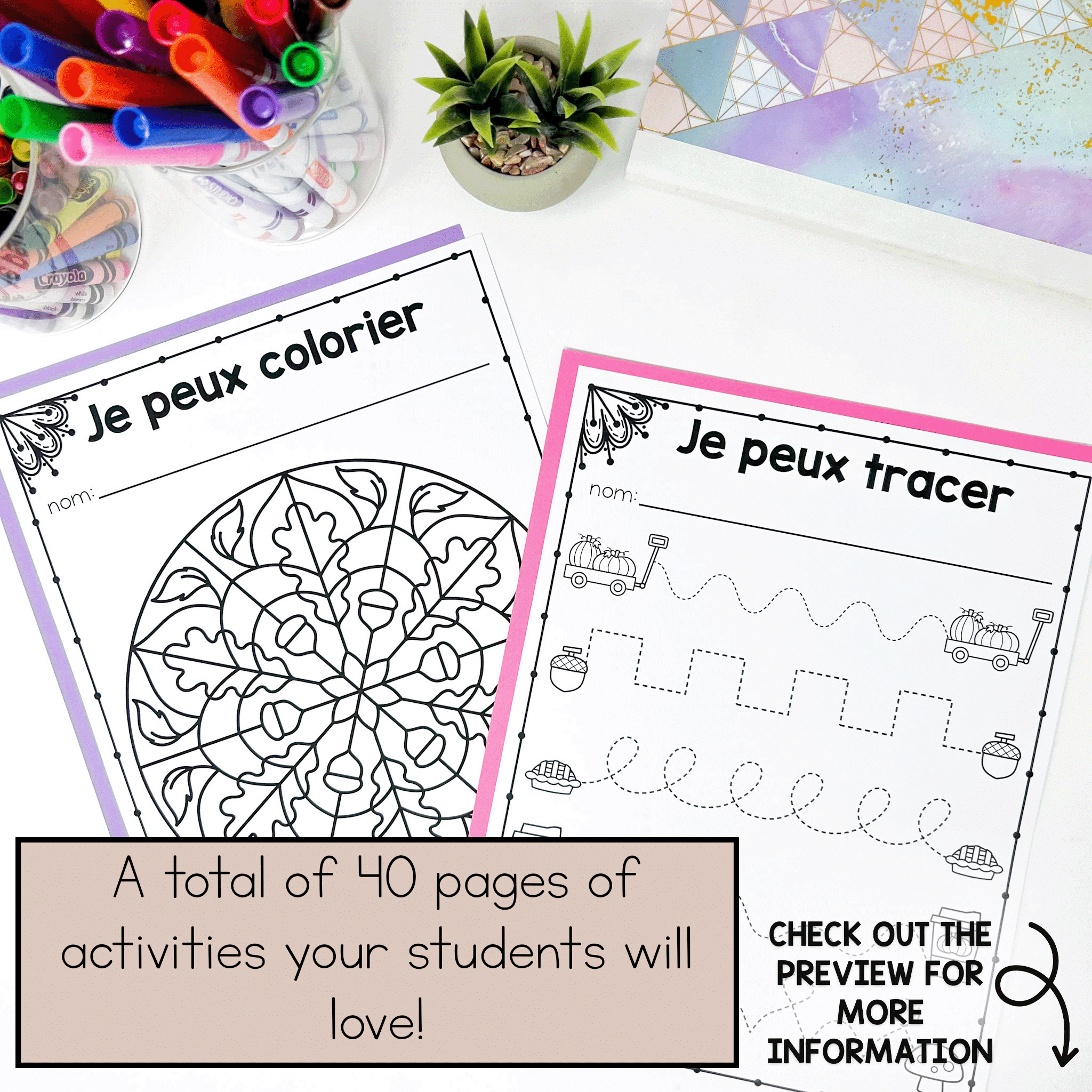 Are you looking for simple but engaging French Fall math and literacy worksheets for maternelle and première année? This NO PREP kindergarten Math and Literacy pack is perfect for you! It contains 30+ pages of activities to work on various math, literacy and fine motor skills. Your kindergarten students will love the l’automne theme while they work on their math and French skills!