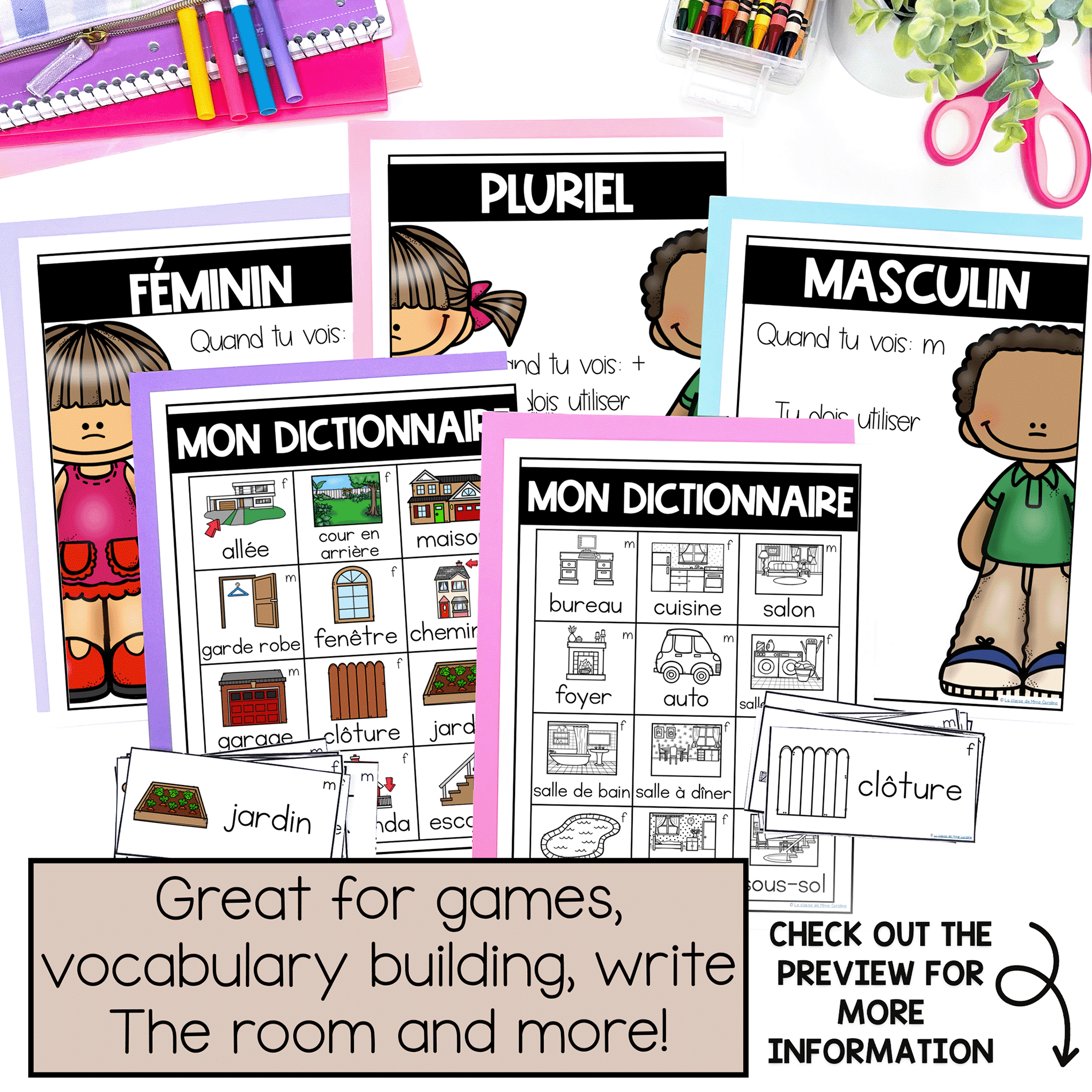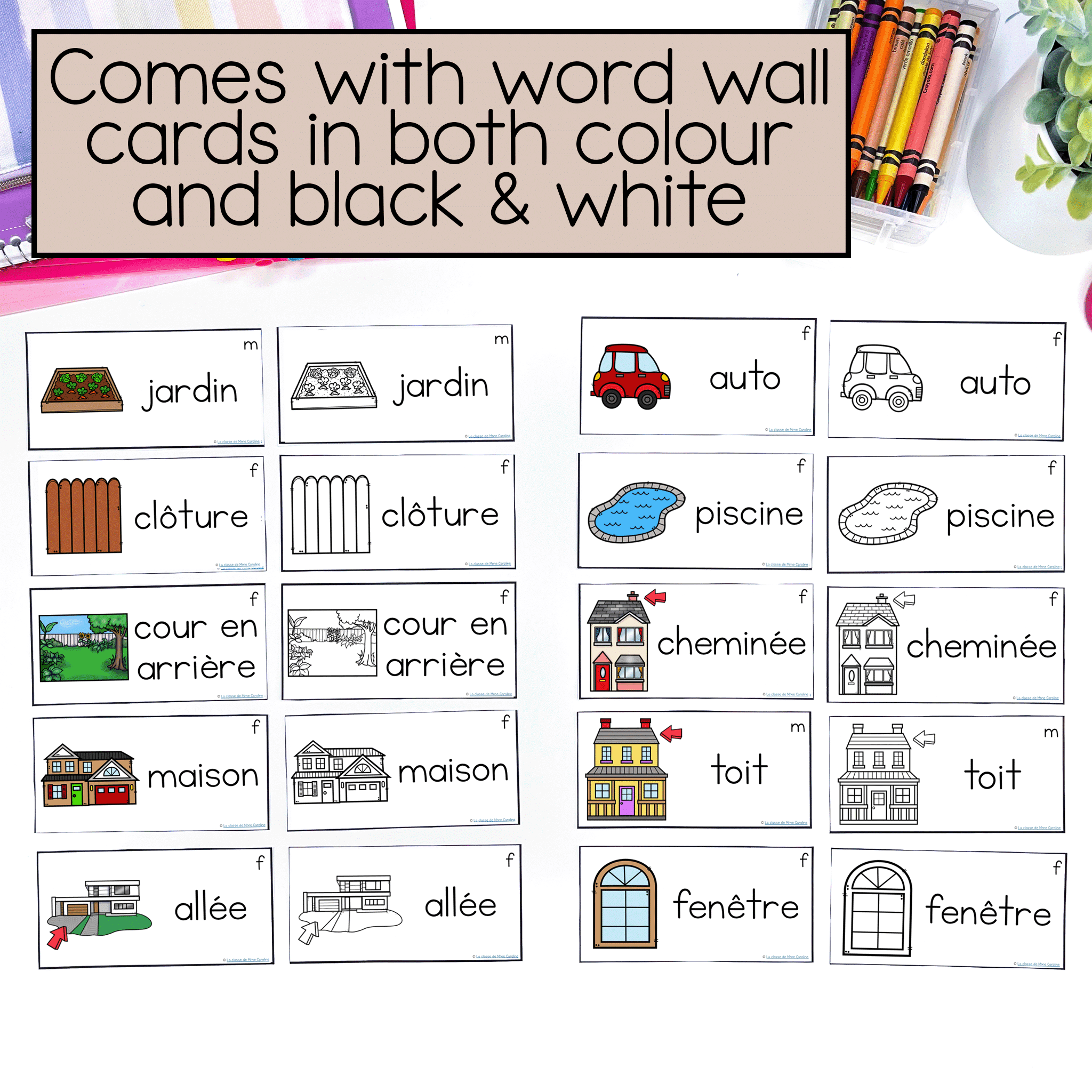 Prep is quick and easy… Just print the pages, laminate and cut out. Then you’re ready to go! Each card includes an f or an m in the corner for students to differentiate between les mots masculin, les mots féminin and les mots pluriel. This allows the student to add the appropriate article themselves.