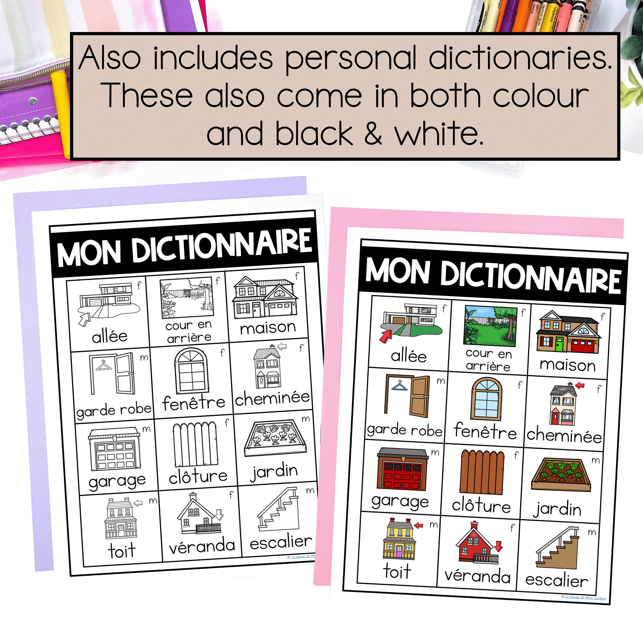 Make learning about la maison effortless by using these French word wall cards. Your students will have an easy time using the new words they’ve learned either orally or through writing with the French personal dictionary also included. All cards feature a clear image of the word and an easy to read font – perfect for young learners and older learners!
