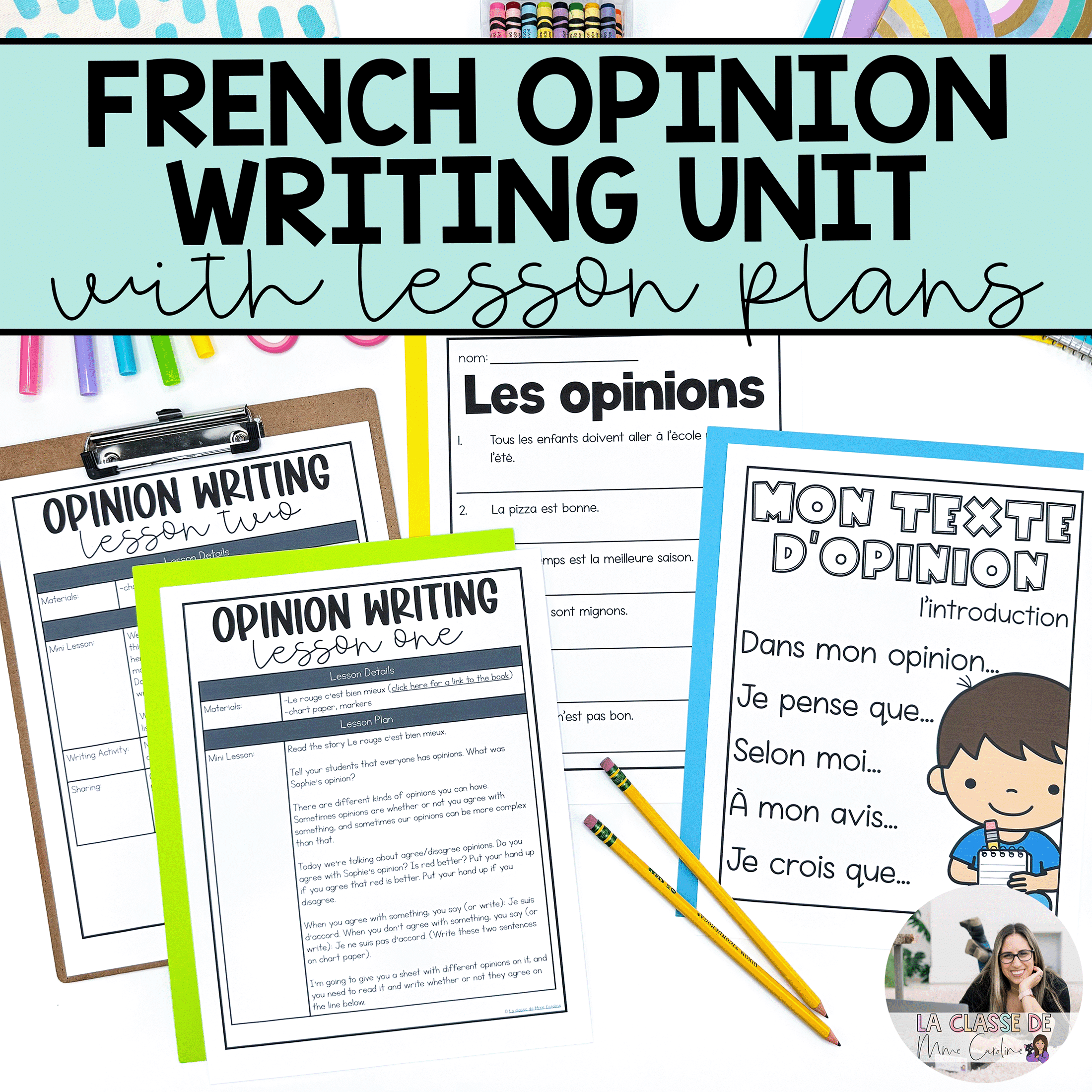 French opinion writing unit with lesson plan, anchor chart, and worksheet pages