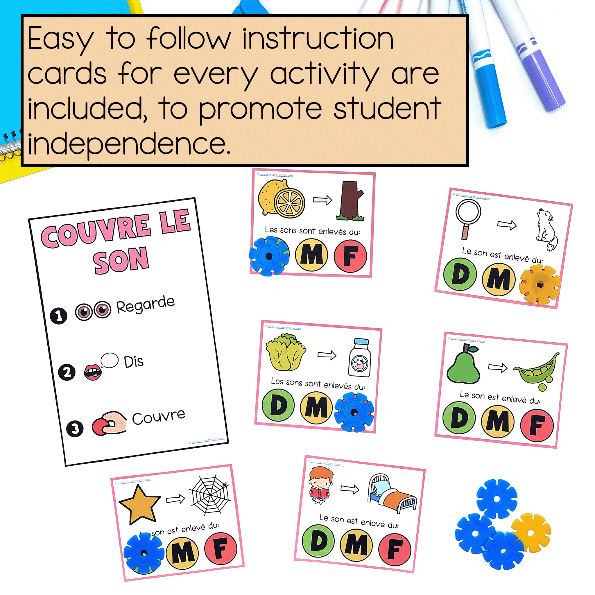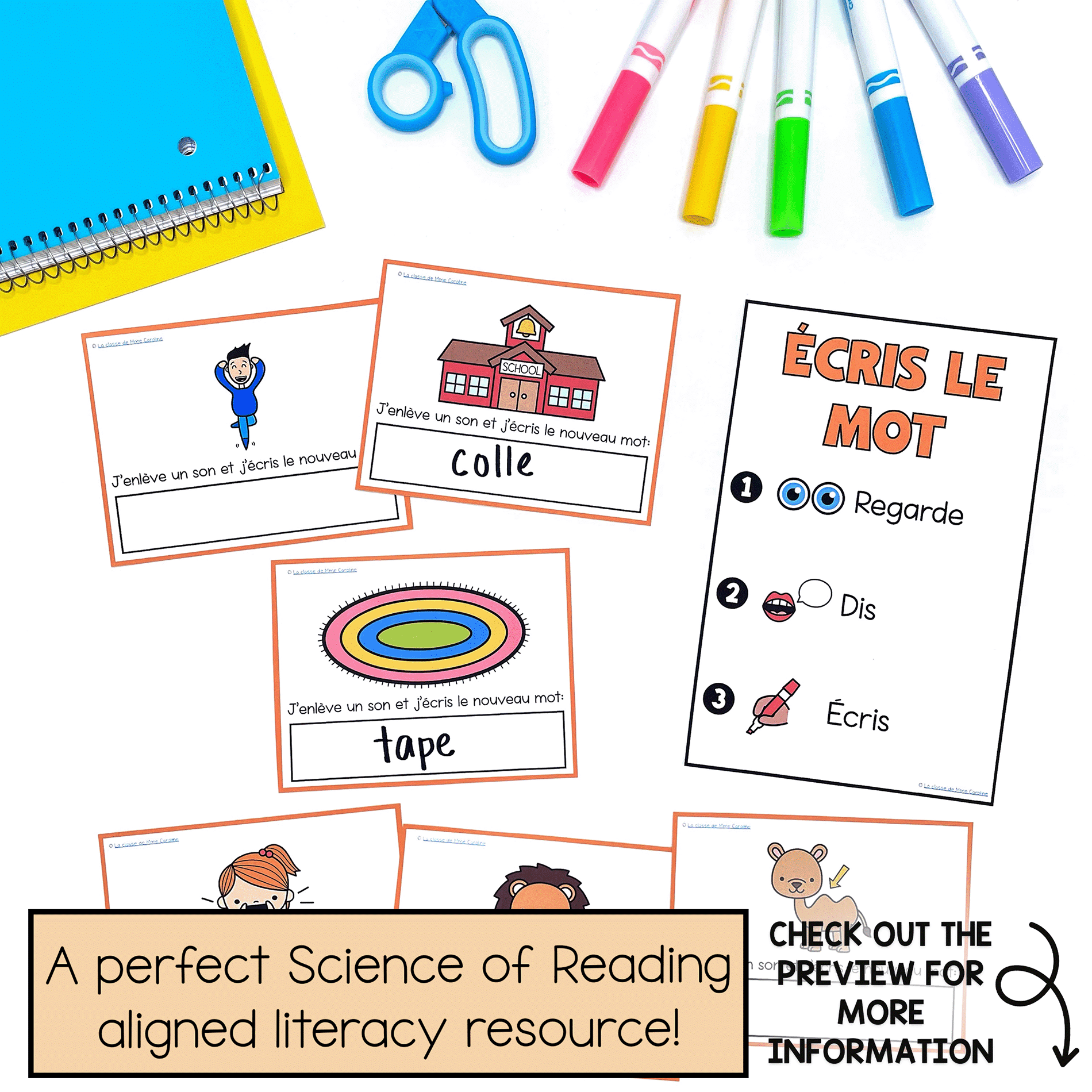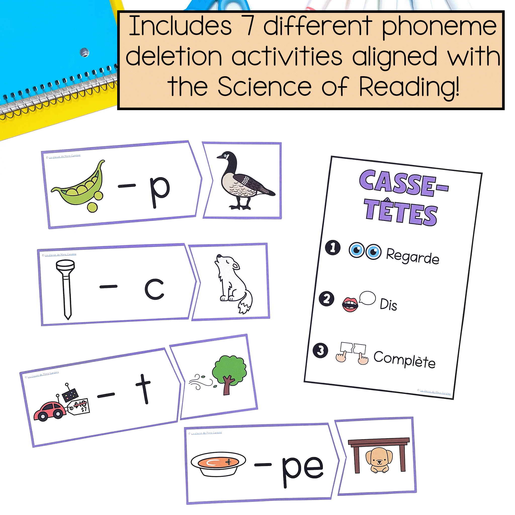 Make teaching French phoneme deletion engaging with this pack of hands-on phoneme task cards! This set includes 5 low-prep phonemic awareness activities where students practice phoneme deletion, perfect for teaching your students phonological awareness skills and to help them learn to read in French. The best part? These activities are aligned with the French Science of Reading!