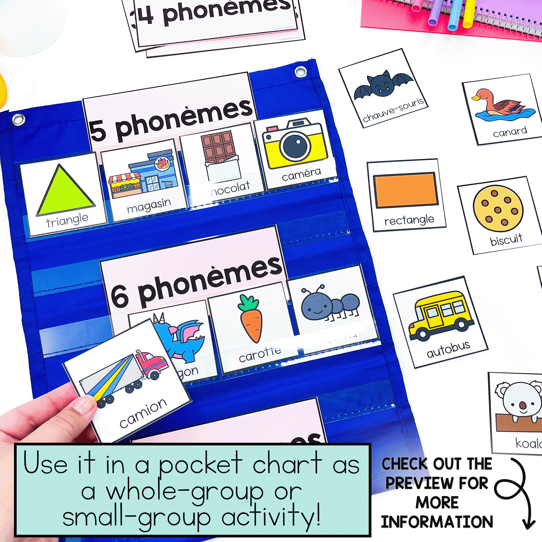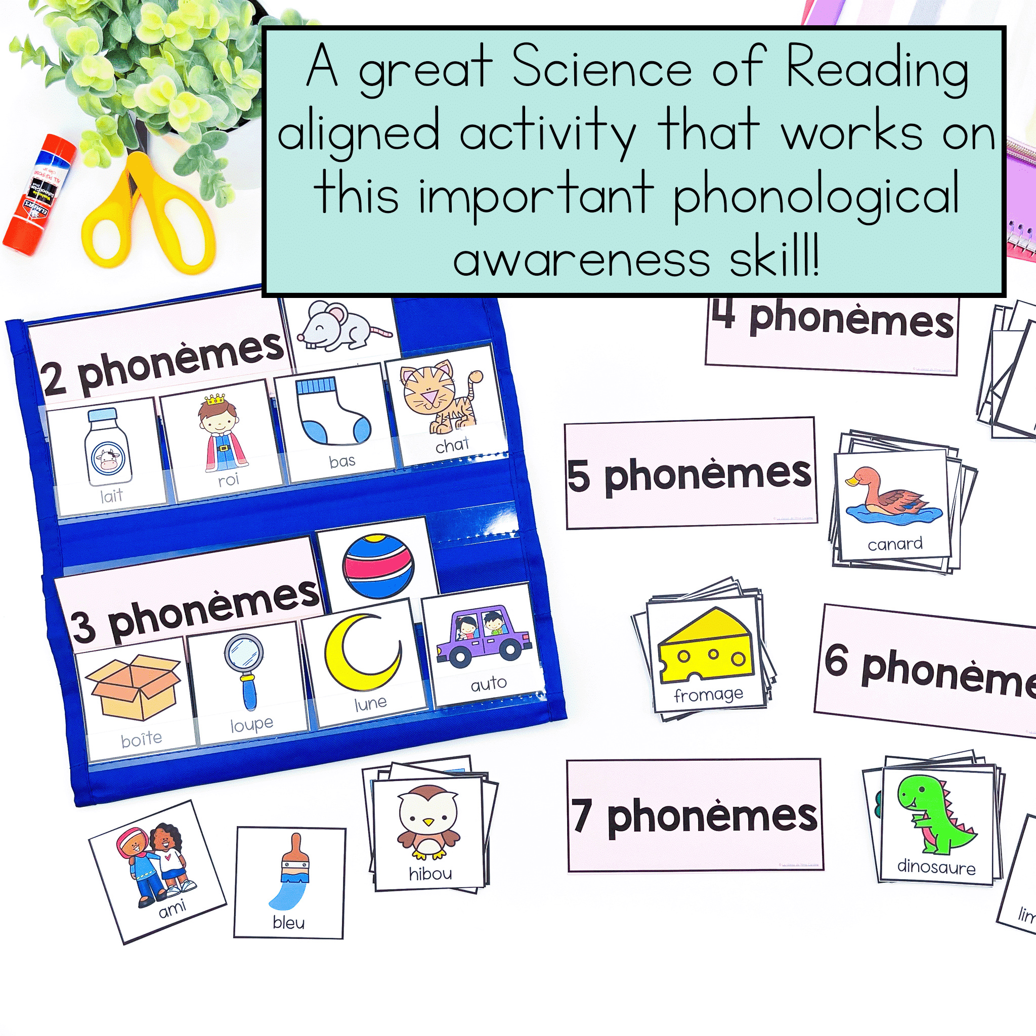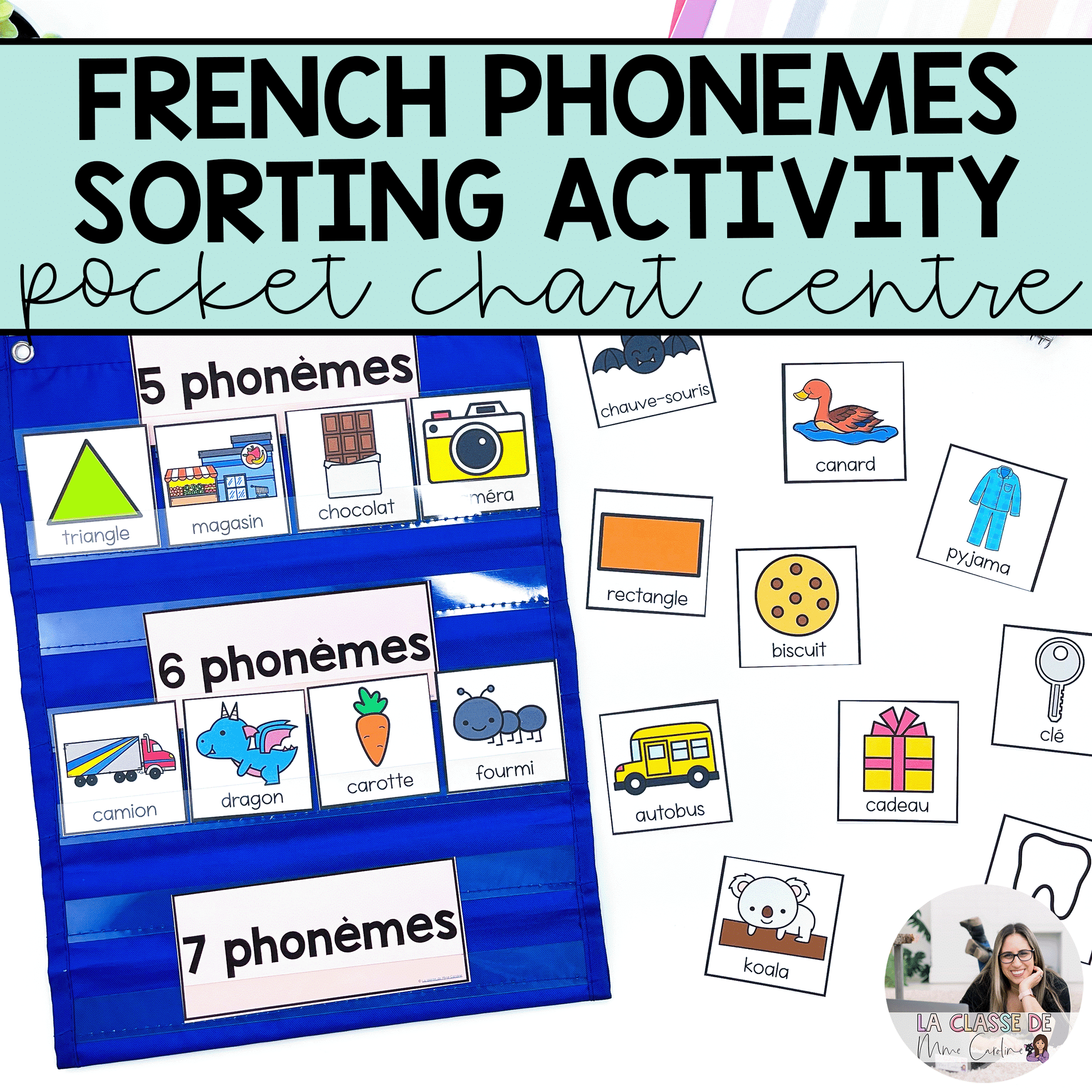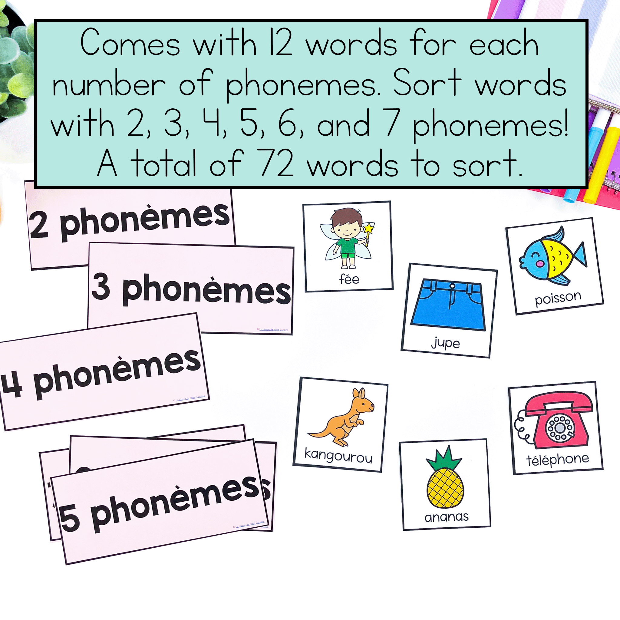 Make teaching French phonological awareness skills engaging with this phoneme counting pocket chart centre! This set includes 72 words that your students can sort by how many phonemes they have.