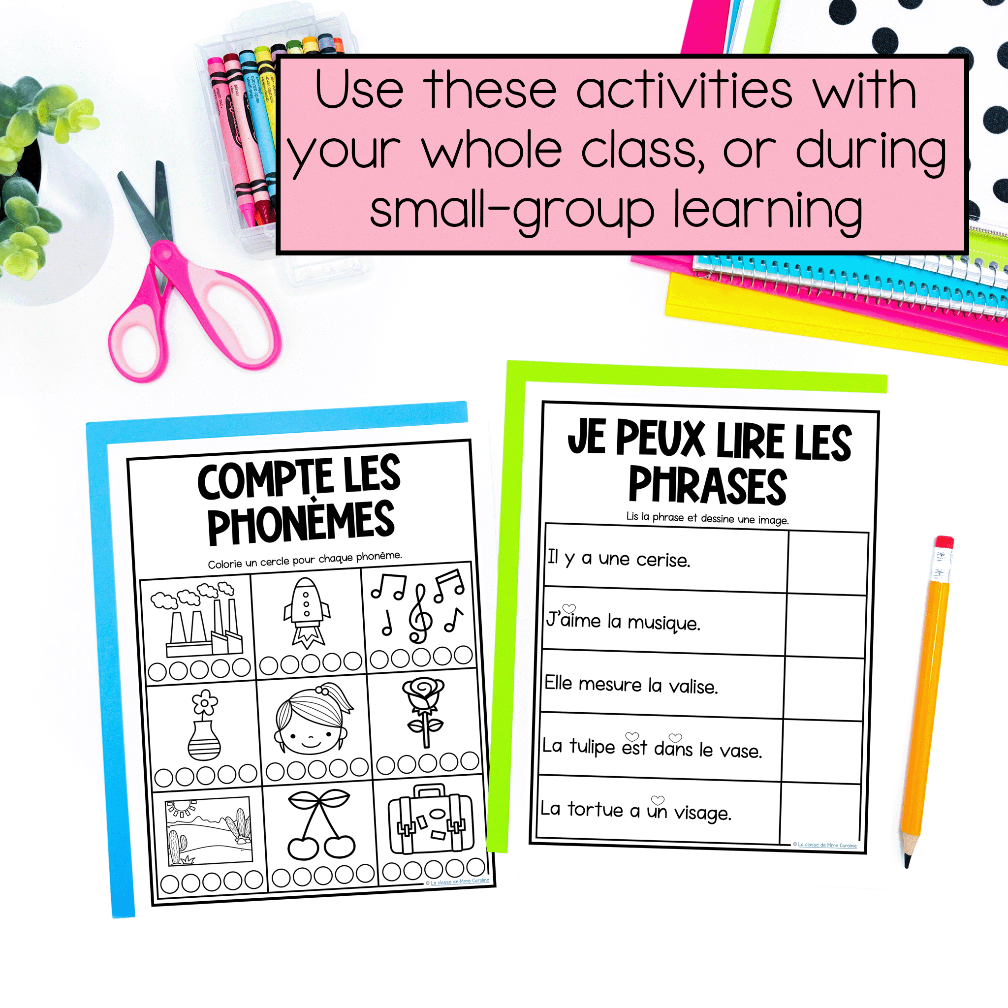 Build K-3 Reading Skills with this bundle that works on decoding, phonological awareness, and phonemic awareness. These French phonics activities are great for beginners, and incorporate fun activities to help make learning to read engaging.