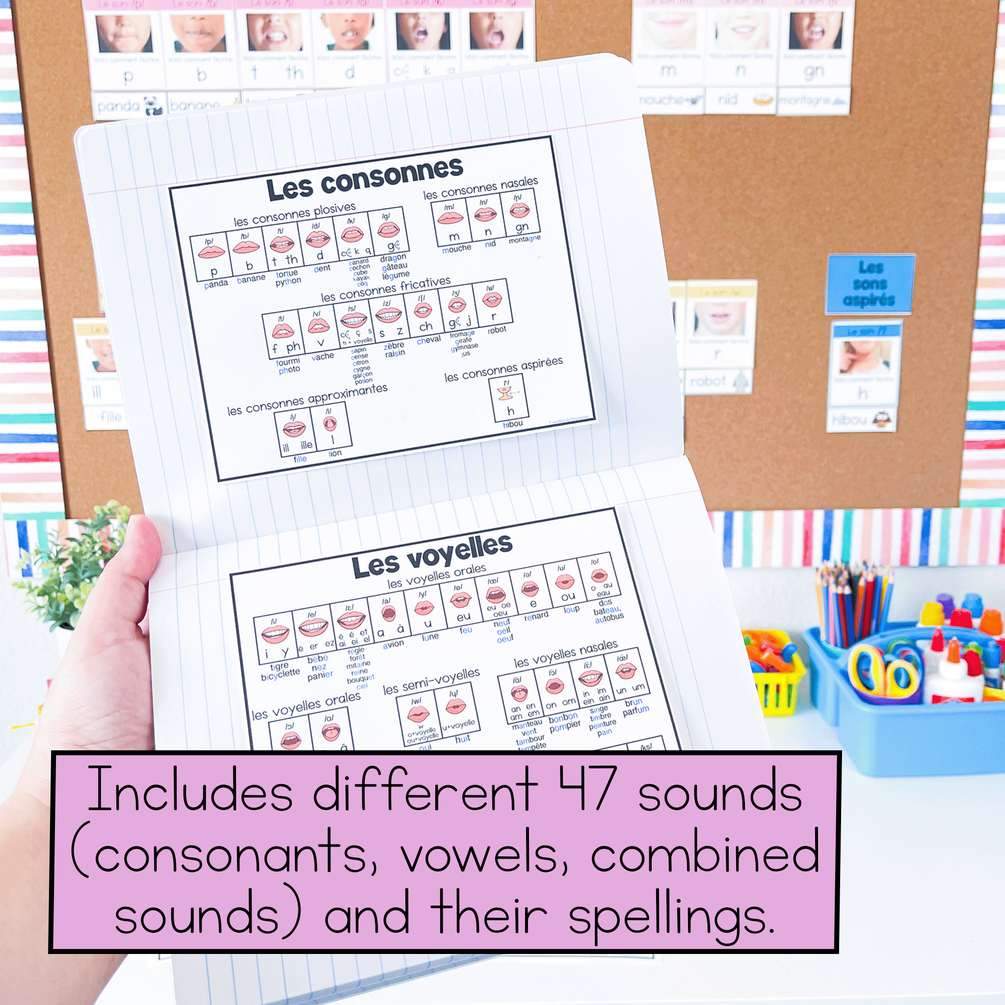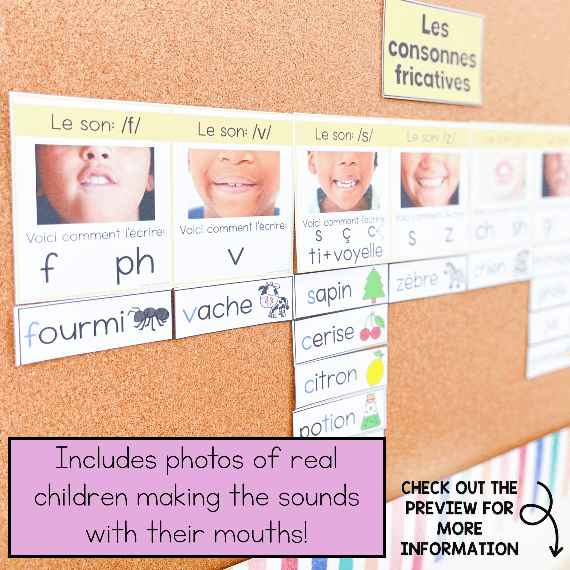 Each phoneme is represented on one card, along with real mouth pictures (diverse kids), the different spellings that represent the French phoneme and real word examples of each spelling.