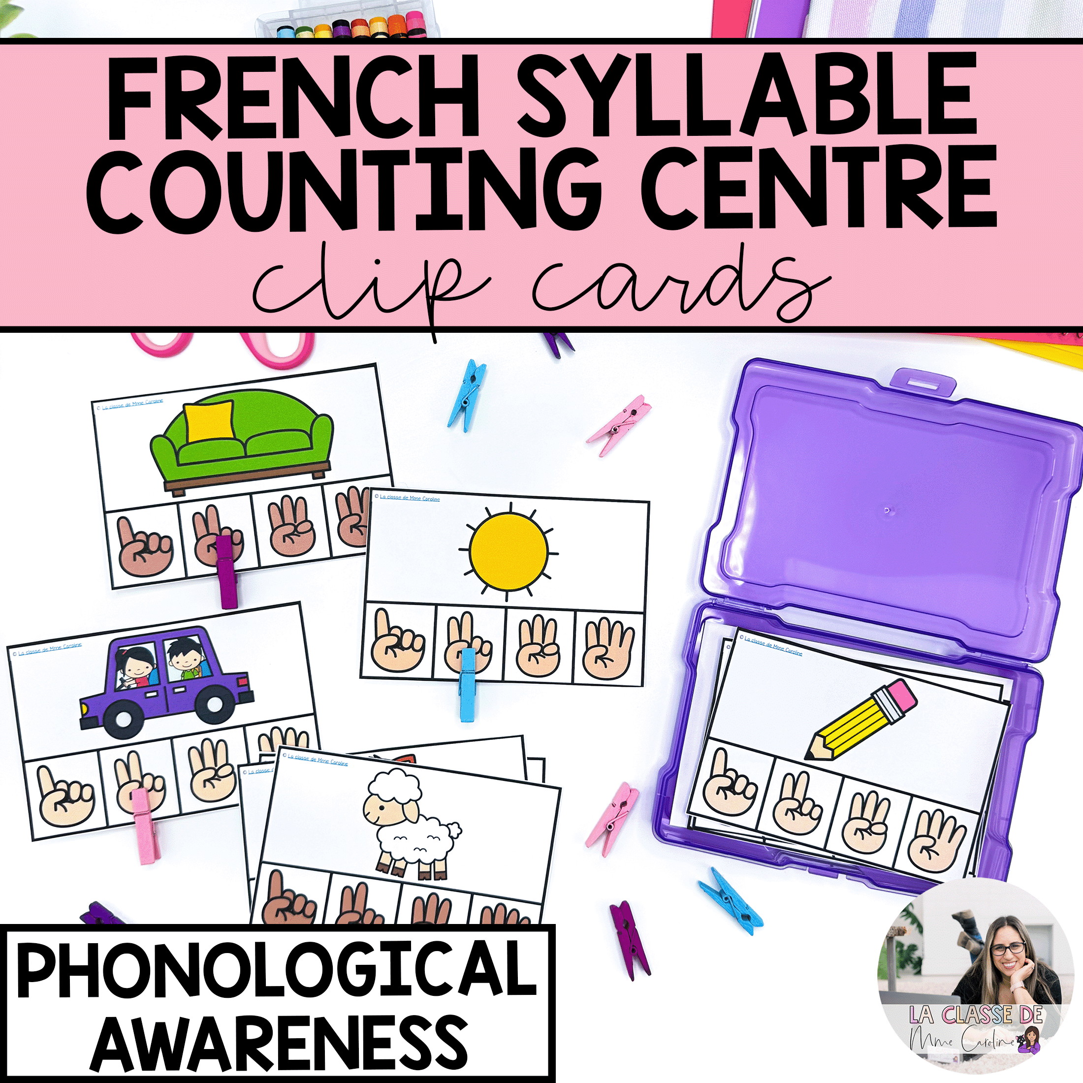 Explore phonological awareness with this French syllables clip cards literacy centre. This set includes 48 task cards that are perfect for practicing the concept of syllable segmentation – an important part of French phonological awareness skills!