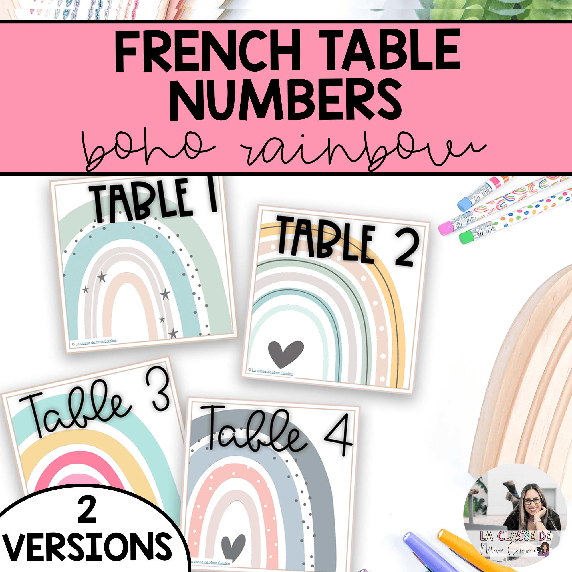 Are you looking for a Table Numbers for your classroom? This set is perfect for your class! It includes 2 versions and goes up to Table 10. It is Boho Rainbow Themed – perfect to go along with rainbow classroom decor!